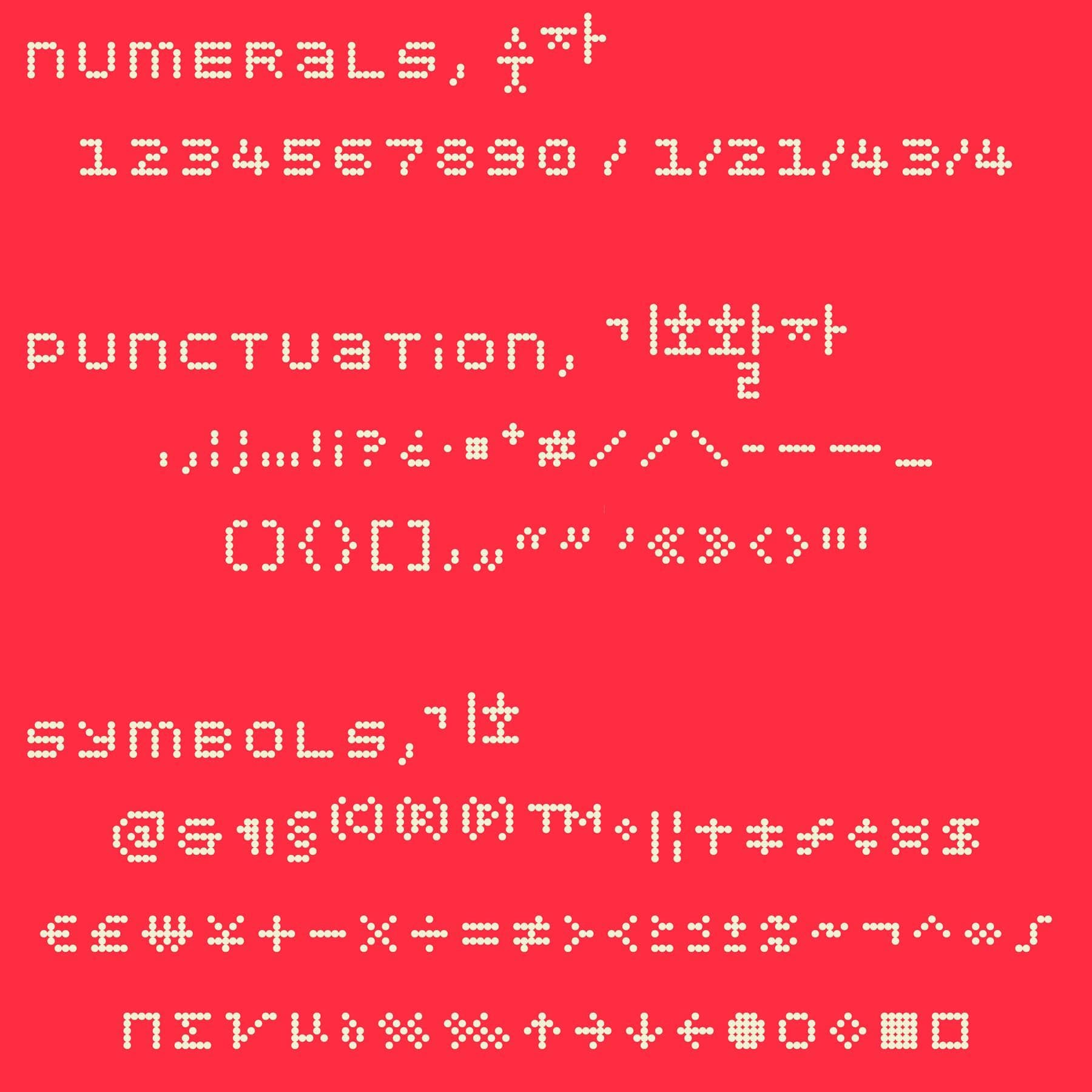 The AG Typography Institute invited us to take part in the a-Project, a reimagining of the iconic 1985 deconstructed Hangeul font, AG AhnSangSoo, designed by Ahn Sang-Soo. The result is AG Unidot. Starting with its name, this typeface is inspired by the universality of dots to create a common style. It recalls retro digital imagery: lettering produced by dot matrix printers, LED signs and early computer graphics. The result is a typeface with a technical yet playful vibe. Unidot uses a modular dot-based system to maintain a cohesive appearance in both Latin and Hangeul scripts that lasts even when they’re together.