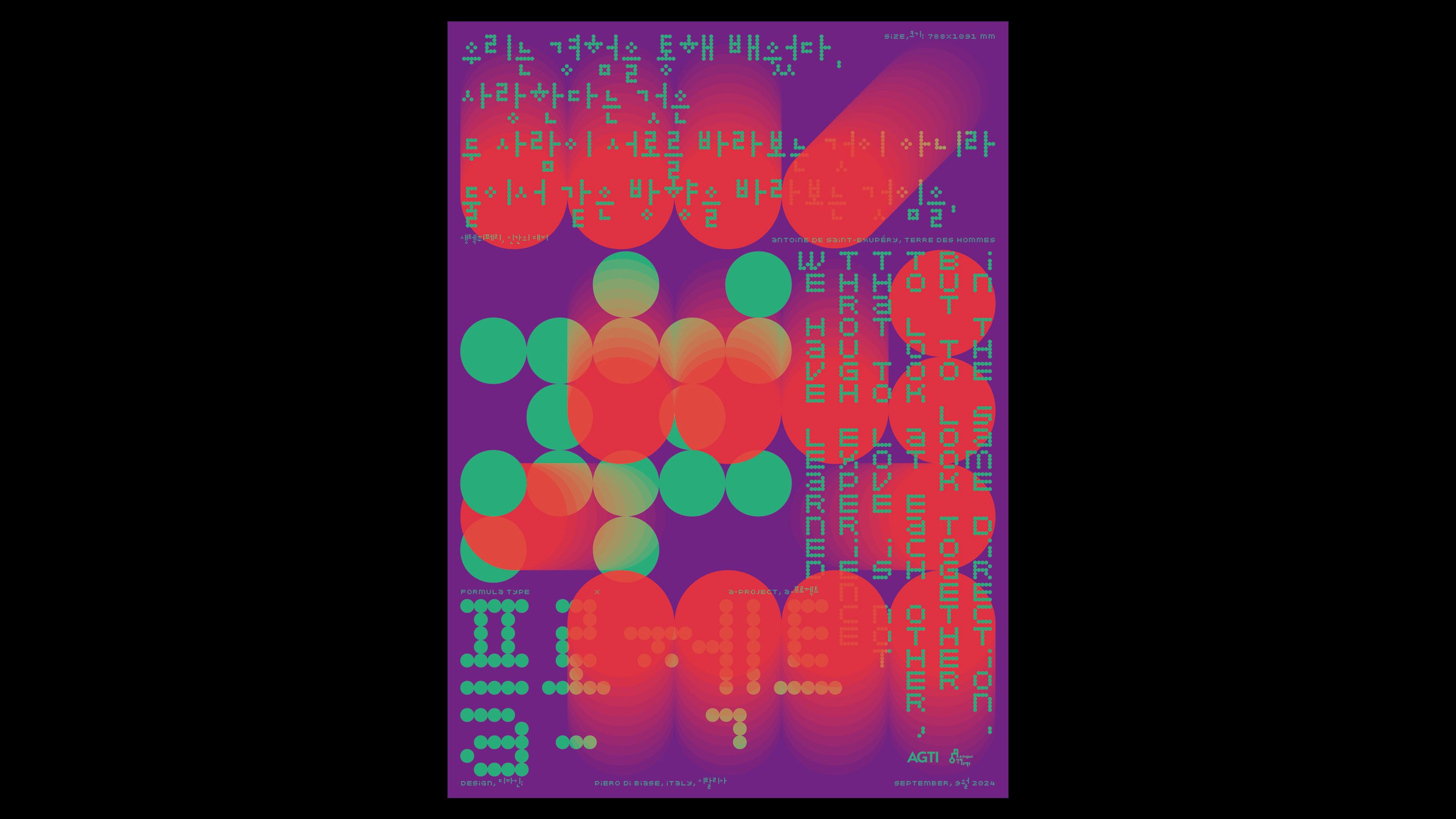 Poster showcasing the typeface AG Unidot designed for the a-Project. The poster was designed with the purpose of emphasising and showing the potential of the typeface through a sophisticated layout, which combines texts of various sizes with transparencies and vivid colours.